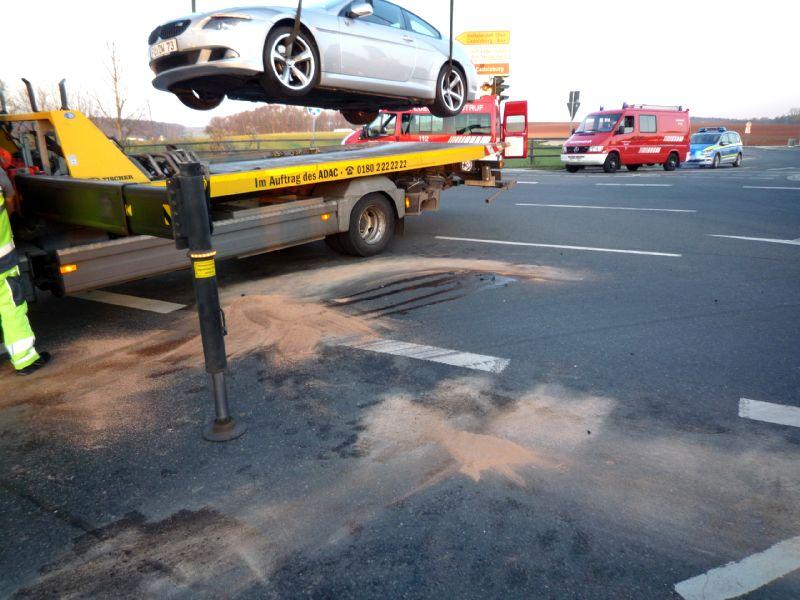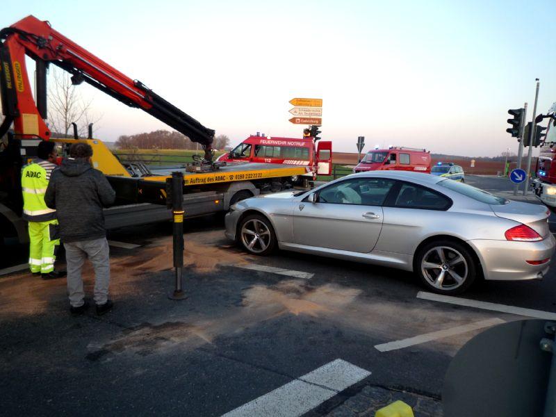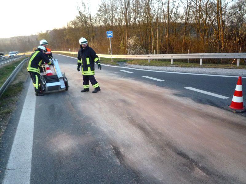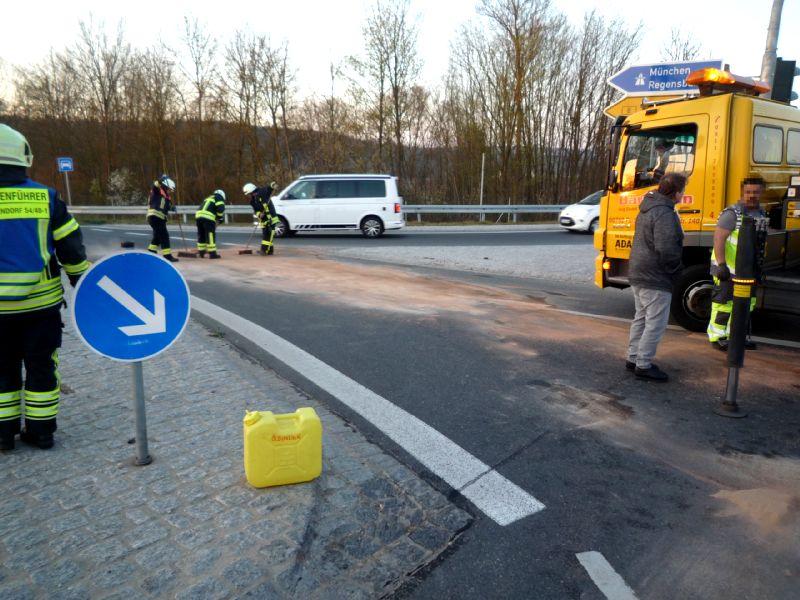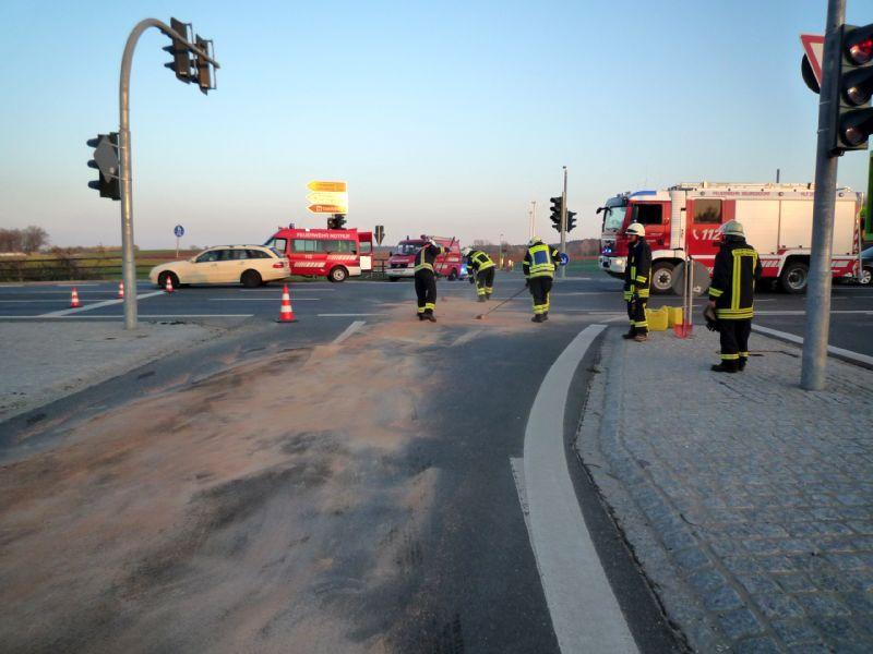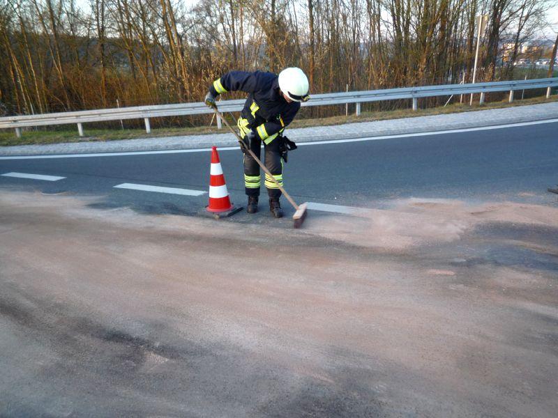 Eine Polizeistreife, welche einen Unfall aufgenommen hatte alarmierte uns zum reinigen der Fahrbahn. Es sind Öl und andere Betriebsstoffe ausgelaufen und haben sich großflächig auf der Fahrbahn verteilt. Während der Reinigungsmaßnahmen wurden wir von einem anderen Autofahrer auf eine Panne an seinem Fahrzeug aufmerksam gemacht. Durch einen technischen Defekt verdampfte das Kühlerwasser schlagartig, Mit vereinter Muskelkraft wurde das Pannenfahrzeug in die Nahe gelegene Tankstelle geschoben.