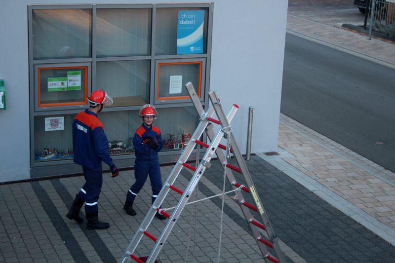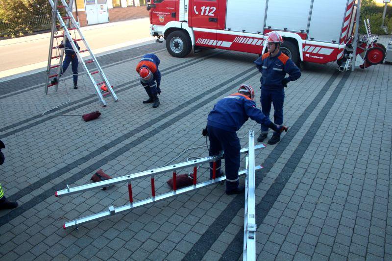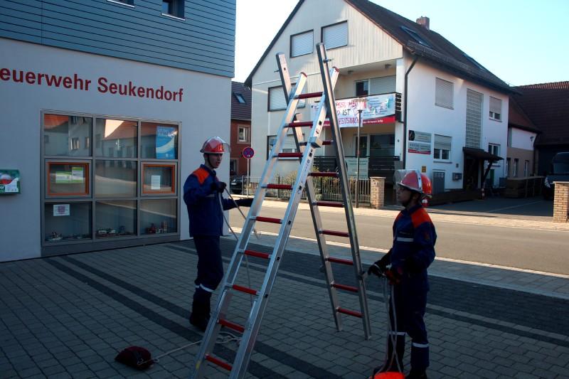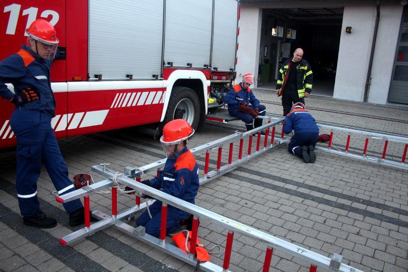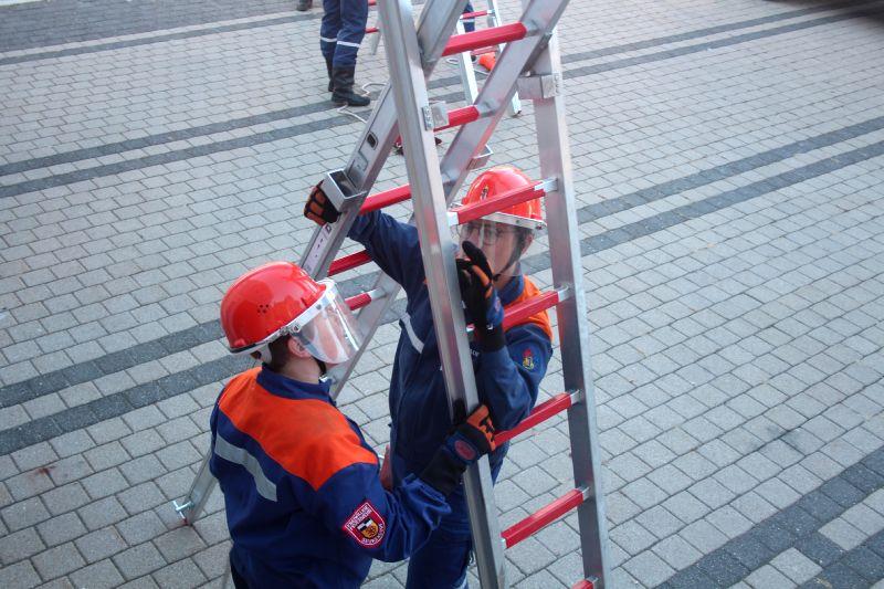 Zuerst suchten sich die Jugendlichen die nötigen Materialien selbst zusammen, danach wurde erst in langsamen Schritten der Aufbau für alle verständliche erklärt und gezeigt. Nachdem der Ehrgeiz der Mannschaft geweckt wurde, zeigen uns die Nachwuchskräfte wie schnell es geht einen Leiterbock zu bauen.
