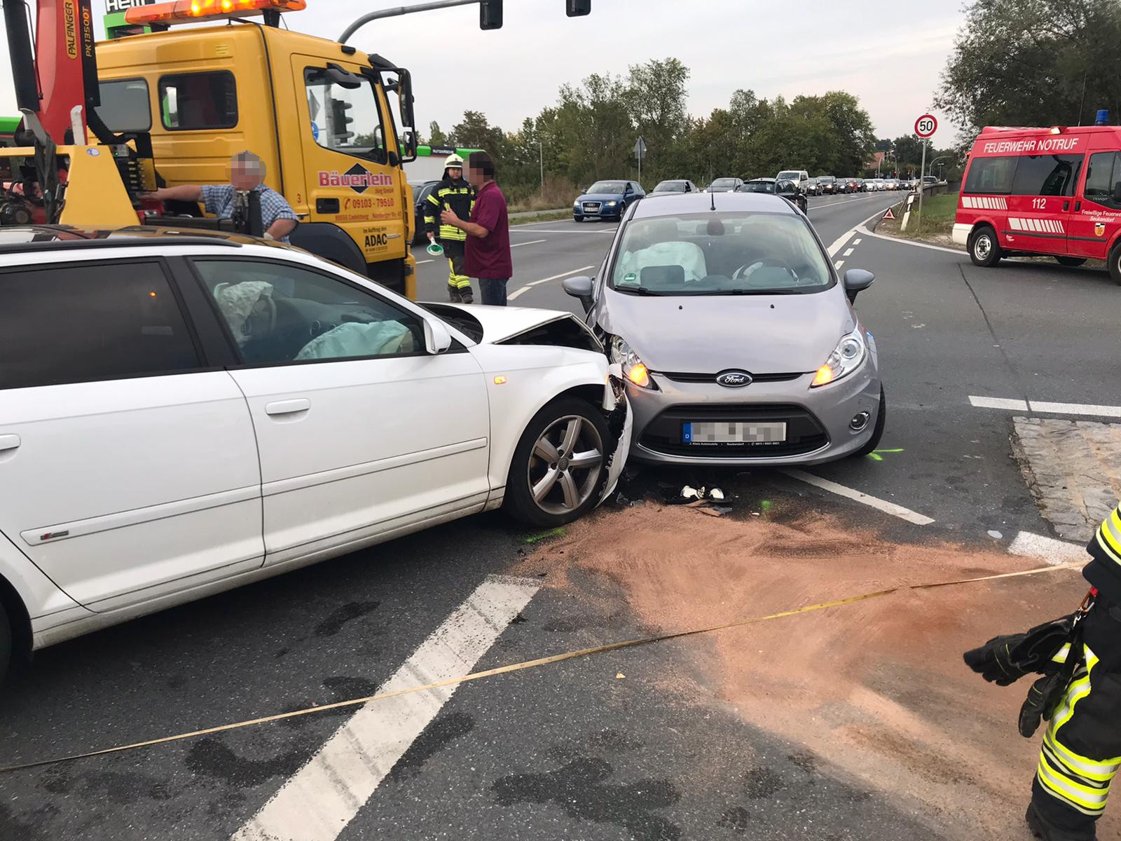 Am Nachmittag des 01.10.2020 wurde die FF Seukendorf durch die Polizei zu einem Verkehrsunfall auf Höhe der HEM Tankstelle in Seukendorf alarmiert. Vorort waren zwei PKW frontal zusammen gestoßen. Im Verlauf der Unfallaufnahme durch die Polizei wurde noch ein Rettungswagen hinzugerufen. Die FF Seukendorf übernahm die Verkehrslenkung sowie das Abbinden der auslaufenden Betriebsstoffe.