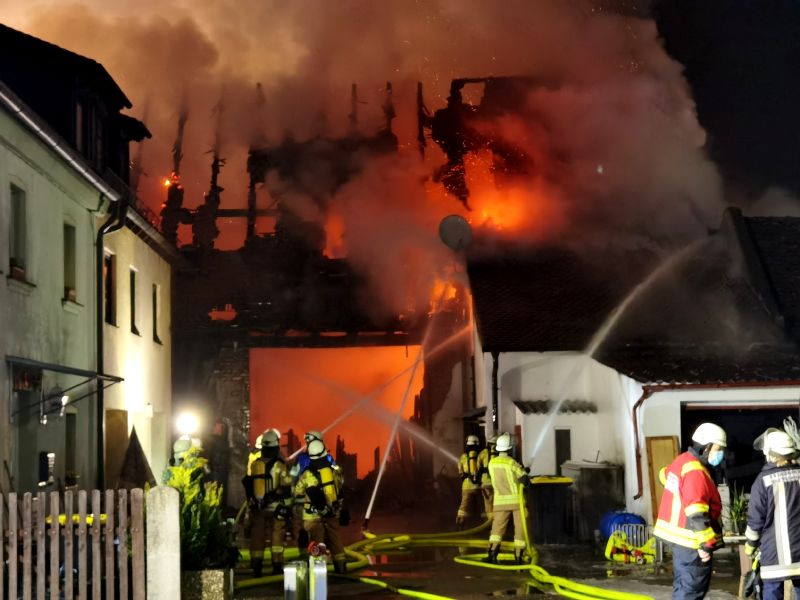 Um 21:29 war es für die Kameraden aus Seukendorf vorbei mit der Ruhe am 12.12.2020. Sie wurden zusammen mit den Feuerwehren aus Veitsbronn, Raindorf / Kagenhof, Retzelfembach und Cadolzburg zu einem Scheuenbrand in Siegelsdorf alarmiert. Bereits auf der Anfahrt von Seukendorf war ein Feuerschein sichtbar. Vor Ort stand eine Scheune in Vollbrand, nach Rücksprache mit der Einsatzleitung vor Ort wurde zwei Brandabschnitte gebildet, die eine Seite der Scheune wurde mit einem massiven Löschangriff von den Kameraden aus Cadolzburg übernommen. Der andere Abschnitt beinhaltete eine Riegelstellung um eine Ausbreitung auf umliegende Gebäude zu verhindern. Diesen wurde der FF Seukendorf zugeteilt. Da im weiteren Verlauf noch mehr Löschwasser benötigt wurde, wurden die Feuerwehren aus Rossendorf und Zweifelsheim/Höfen nachalarmiert. Die UG ÖEL (Unterstützungsgruppe Örtliche Einsatzleitung) übernahm die Koordination der eingesetzten Kräfte und kontrolliere mittels einer Drohne von oben den Brandherd auf weitere Glutnester. Die Einheiten aus Seukendorf waren nach ca. 3 Stunden wieder zurück am Standort. Für die Kameraden aus Veitsbronn dauerte der Einsatz bis in die frühen Morgenstunden an. Zur Verpflegung der verbliebenen Einheiten wurden auch noch die Betreuungskomponenten des BRK Fürth´s alarmiert.