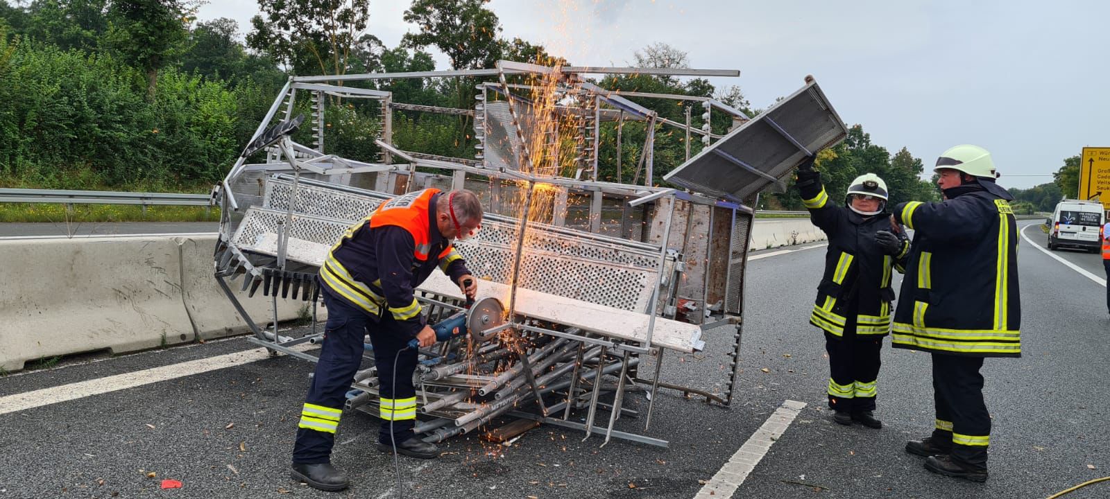 Am 15.09.2021 um 8:00 wurden die Kräfte der FF Seukendorf zu einem Unfall auf die B8 alarmiert. Dort verlor ein Handwerkerbetrieb während der Fahrt ein Gerüst von dem genutzten Anhänger. Die Einheiten zerteilten mittels Winkelschleifer das total verzogenen und verbogene Transportgestell und sammelten bis zum Eintreffen der Autobahnmeisterei die Teile auf dem Standstreifen. Somit konnten die wartenden Fahrzeuge auch zügig die Weiterfahrt aufnehmen.