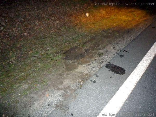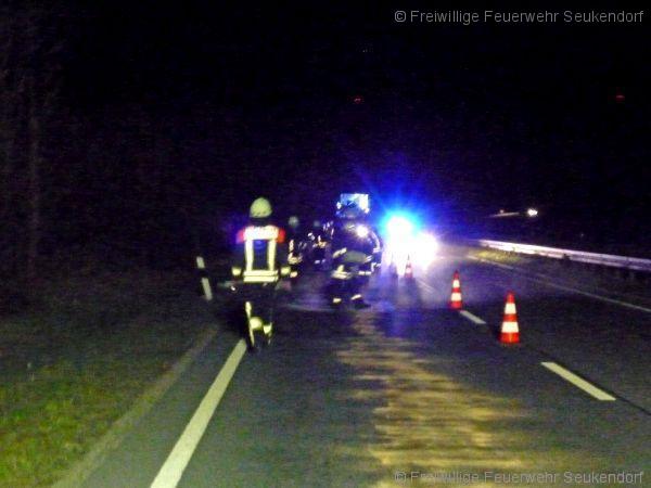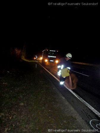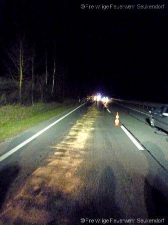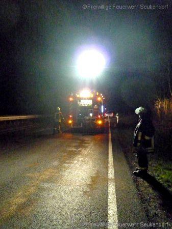 In der Nacht vom 28. auf den 29.03.2017 wurde kurz vor Mitternacht die FF Seukendorf zu einer Ölspur auf die B8 alarmiert. Kurz nach der Anschlußstelle Langenzenn Horbach wurde ein Pannenfahrzeug, welches bereits durch den Abschleppdienst verladen wurde ausfindig gemacht. Durch eine technischen Defekt erstreckte sich auf der rechten Fahrspur eine ca. 600 m lange Ölspur. Diese Ölspur wurde durch die FF Seukendorf abgebunden. Nach einer guten Stunde konnten alle aktiven wieder nach Hause in Ihr Bett.